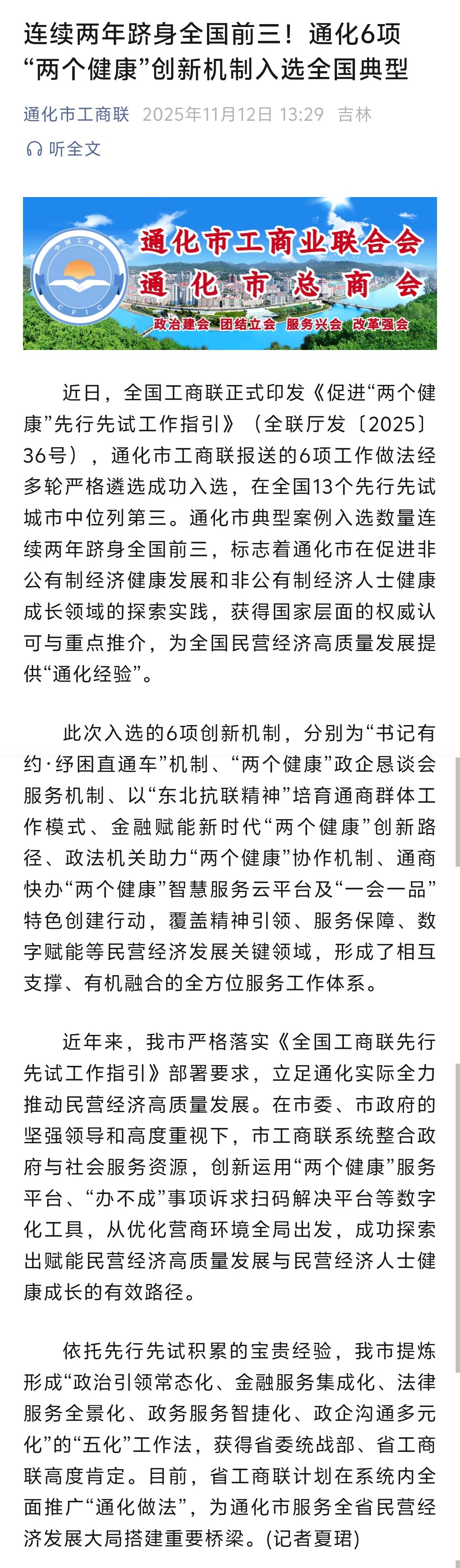 连续两年跻身全国前三!通化6项“两个健康”创新机制入选全国典型